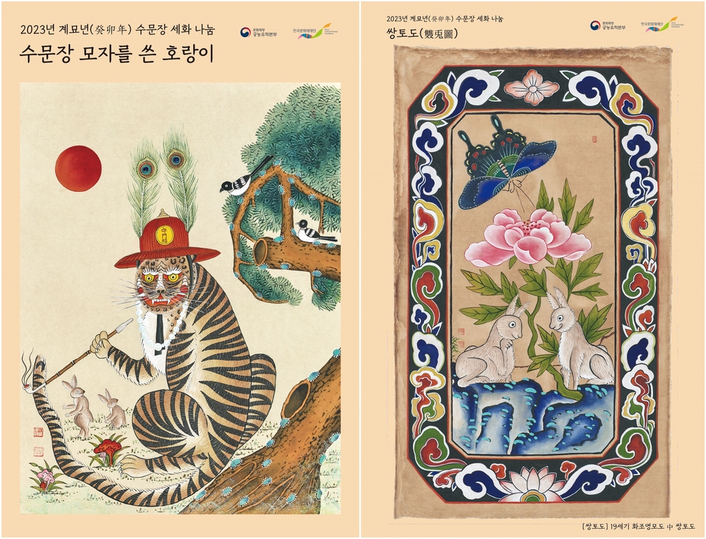 | ▲ '수문장 세화 나눔' 행사에서 선보이는 민화 왼쪽은 '경복궁 수문장 모자를 쓴 호랑이', 오른쪽은 '쌍토도' [문화재청 제공. 재판매 및 DB 금지] |
