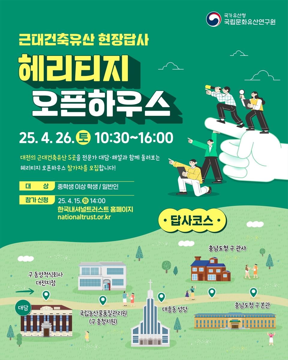 (서울=연합뉴스) 김예나 기자 = 국립문화유산연구원은 이달 26일 대전에서 근대 건축유산 현장을 답사하는 '헤리티지 오픈하우스' 행사를 연다고 14일 밝혔다.