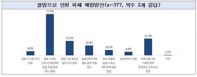 스태프가 생각하는 대책으로는 '결방 시에도 근무시간에 따른 임금 지급'(77.2%), '프로그램 사전 기획 단계에 투입되는 근무시간 인정'(31.3%), '결방기간 동안은 업무지시 금지'(27.1%), '계약서에 결방 관련 조항 명시'(18.6%) 순이었다.