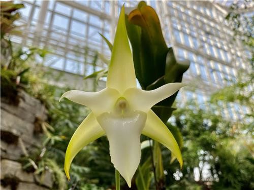 The orchid plant Angraecum sesquipedale, commonly known as Darwin's Orchid, is in bloom at a national arboretum in Sejong, central South Korea, in this undated photo released by the arboretum on March 10, 2021. The plant was discovered by British scientist Charles Darwin on an expedition to its native habitat in Madagascar. (Yonhap)