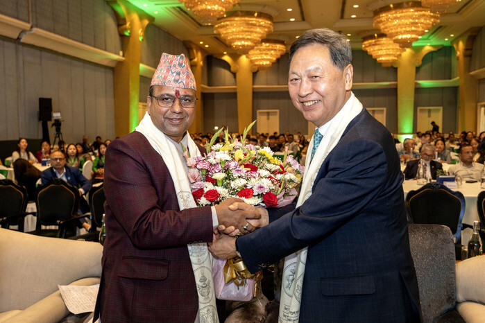 Kang Tae-sun (R), chairman of South Korean sportswear company Black Yak, shakes hands with Nepalese Culture Minister Badri Prasad Pandey during the Summit for Earth in Kathmandu on July 5, 2025, to release a climate charter for the future of the Himalayan mountain range. (Pool photo) (Yonhap)