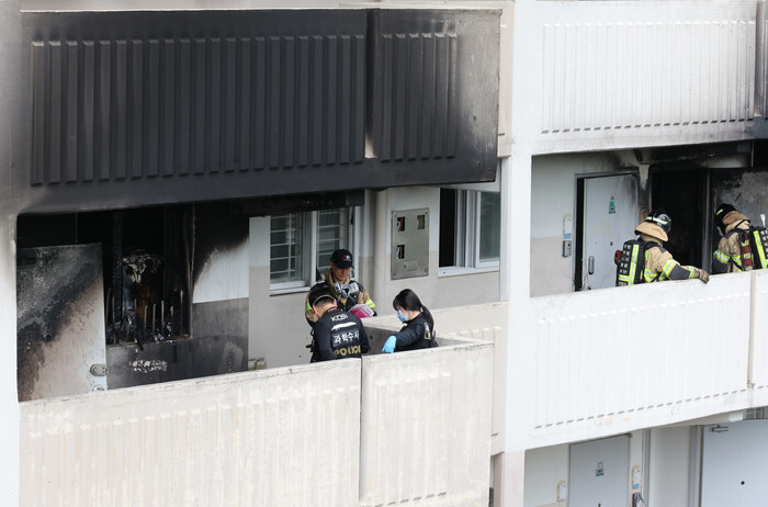 A forensic investigation team examines a gutted unit in an apartment complex in Seoul's Gwanak Ward on April 21, 2025, where a fire earlier in the day killed a resident and injured 11 others. (Yonhap)