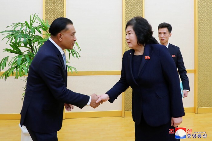 North Korean Foreign Minister Choe Son-hui (R) meets with Phongsavanh Sisoulath, permanent secretary of the Laotian foreign ministry, at the Mansudae Assembly Hall in Pyongyang on March 3, 2025, in this photo released by the North's official Korean Central News Agency the next day. (For Use Only in the Republic of Korea. No Redistribution) (Yonhap)