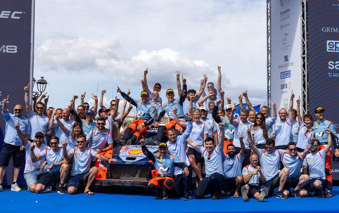 This photo provided by Hyundai Motor Co. shows the South Korean carmaker's motorsport team celebrating their victory at the FIA World Rally Championship in Sardegna, Italy, from May 30-June 2, 2024. (PHOTO NOT FOR SALE) (Yonhap)