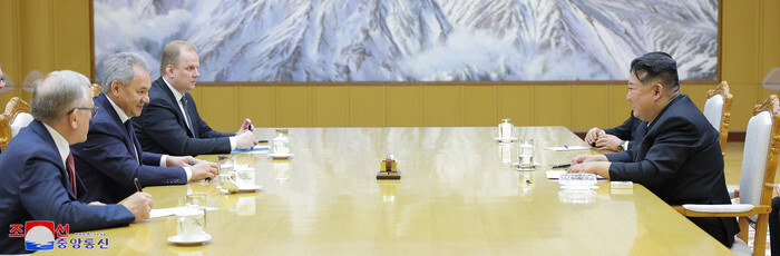 North Korean leader Kim Jong-un (R) holds talks with Russia's Security Council Secretary Sergei Shoigu (2nd from L) during their meeting in Pyongyang on March 21, 2025, in this photo released by North Korea's official Korean Central News Agency the next day. (For Use Only in the Republic of Korea. No Redistribution) (Yonhap)