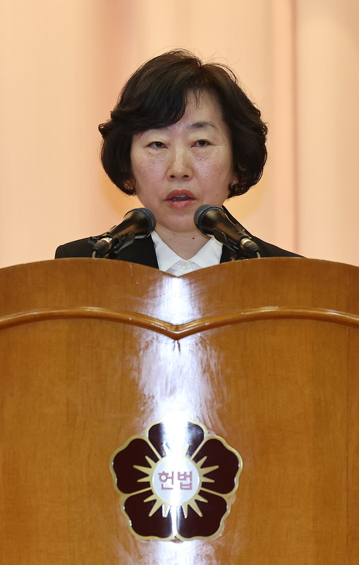 Jeong Gye-seon, a new justice of the Constitutional Court, speaks during a ceremony to mark her inauguration at the court in Seoul on Jan. 2, 2025. (Yonhap)