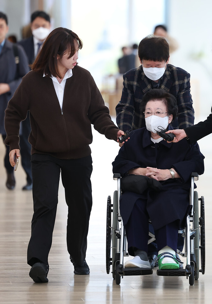 Lee Bae-yong (in wheelchair), former head of the National Education Commission, appears at the office of special counsel Min Joong-ki's team in Seoul on Nov. 13, 2025, to be questioned by the team for the second time over allegations that she gifted a golden turtle ornament to Kim Keon Hee, wife of former President Yoon Suk Yeol, following Yoon's presidential election win in March 2022 in hope of securing a senior government post. (Yonhap)