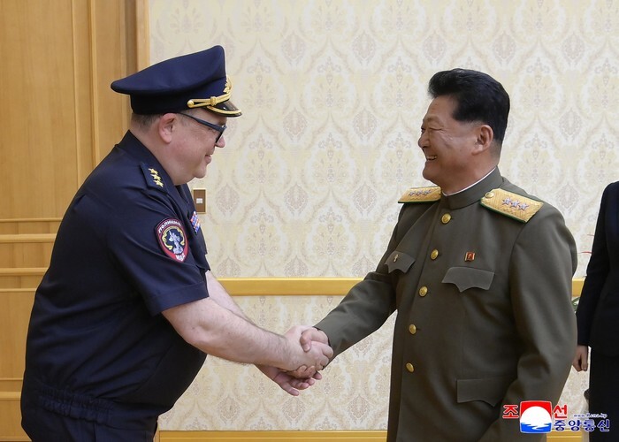 North Korea's Public Security Minister Pang Tu-sop (R) meets with Russia's Deputy Interior Minister Vitaly Shulika, chief of a Russian interior ministry delegation, prior to their talks at the Mansudae Assembly Hall in Pyongyang on May 28, 2025, in this photo released by the North's official Korean Central News Agency the next day. (For Use Only in the Republic of Korea. No Redistribution) (Yonhap)