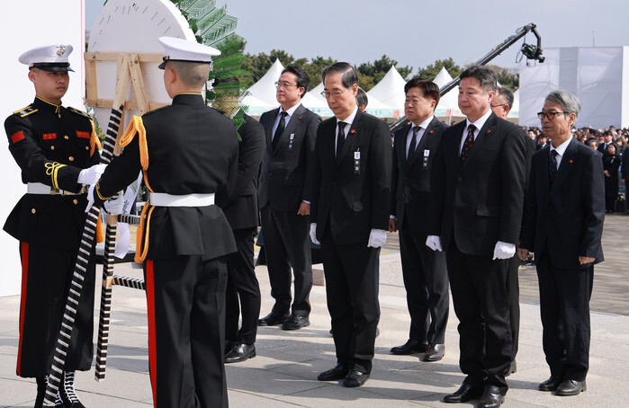 Acting President Han Duck-soo (C), who concurrently serves as prime minister, places a wreath of flowers during a ceremony at the Peace Park in the city of Jeju on South Korea's largest island of the same name on April 3, 2025, to mark the 77th anniversary of paying tribute to victims of a 1948-1954 massacre caused by an ideological rift between residents of Jeju Island and the mainland government. The April 3 incident led to the killing of tens of thousands of Jeju residents. (Yonhap)