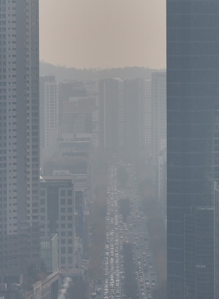 This photo taken Jan. 6, 2025, shows a street in Suseong Ward of the southeastern city of Daegu blanketed in haze, as the atmospheric levels of PM2.5, harmful particles smaller than 2.5 microns in diameter, are forecast to remain "bad" in the city. (Yonhap)