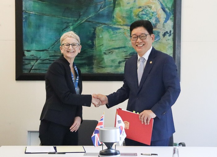 Ko Kwang-hyo (R), chief of the Korea Customs Service, poses for a photo with his British counterpart, Carol Bristow, after signing the mutual recognition agreement (MRA) for authorized economic operator (AEO) in London on June 26, 2024, in this photo released by Ko's office. (PHOTO NOT FOR SALE) (Yonhap)