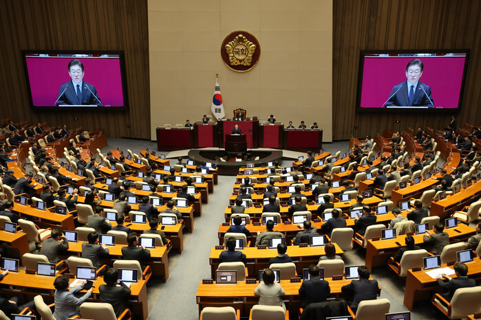 Lee Jae-myung, leader of the main opposition Democratic Party, delivers a policy speech during a plenary session at the National Assembly in Seoul on Feb. 10, 2025. (Yonhap)
