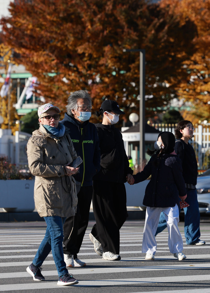 People clad in heavy coats walk across a pedestrian crossing in Seoul on the morning of Nov. 10, 2025, as the temperature fell to an intraday low of 5 C in the capital. (Yonhap)