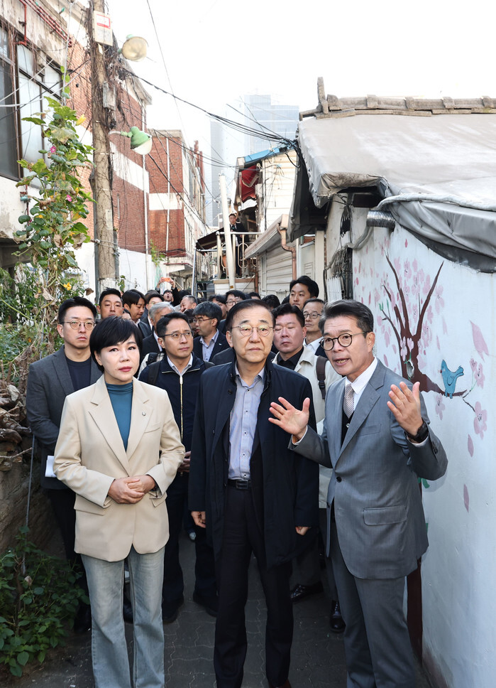 Land and Transport Minister Kim Yun-duk (C, front) and Jeon Hyun-heui (L, front), a lawmaker of the ruling Democratic Party, inspect the site of a reconstruction area in Seoul's Seongdong Ward on Oct. 28, 2025. (Yonhap)