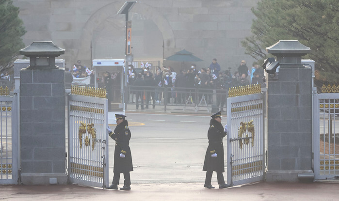 The main gate to the presidential office Cheong Wa Dae is opened in Seoul on Dec. 29, 2025, as President Lee Jae Myung begins working there the same day, with the presidential office officially relocated from the capital's Yongsan Ward after three years and seven months. (Pool photo) (Yonhap)