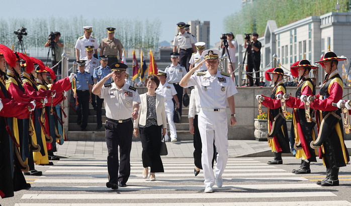 South Korean Joint Chiefs of Staff (JCS) Chairman Adm. Kim Myung-soo (R) and Gen. Yoshihide Yoshida, chief of the Japanese defense ministry's Joint Staff, attends a welcoming ceremony for Yoshida at the JCS' headquarters in Seoul on July 10, 2025. Yoshida has visited South Korea to meet with his South Korean and U.S. counterparts, Adm. Kim Myung-soo and Gen. Dan Caine. (Yonhap)