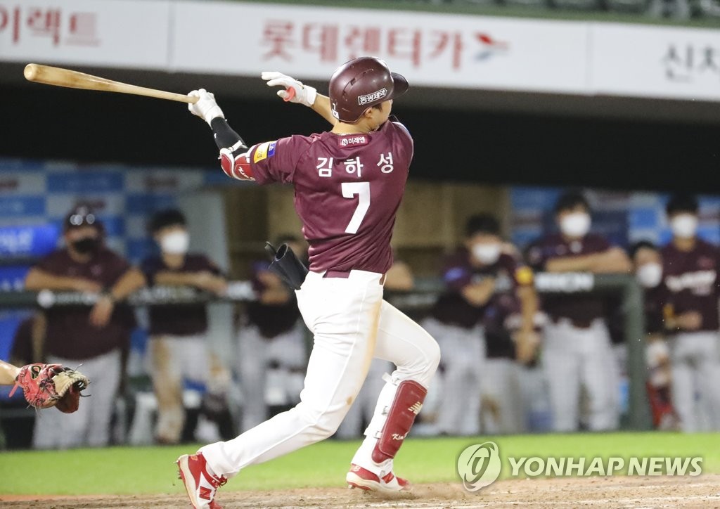 | ▲ In this file photo from Aug. 28, 2020, Kim Ha-seong of the Kiwoom Heroes hits a two-run home run against the Lotte Giants during the top of the ninth inning of a Korea Baseball Organization regular season game at Sajik Stadium in Busan, 450 kilometers southeast of Seoul. (Yonhap) |