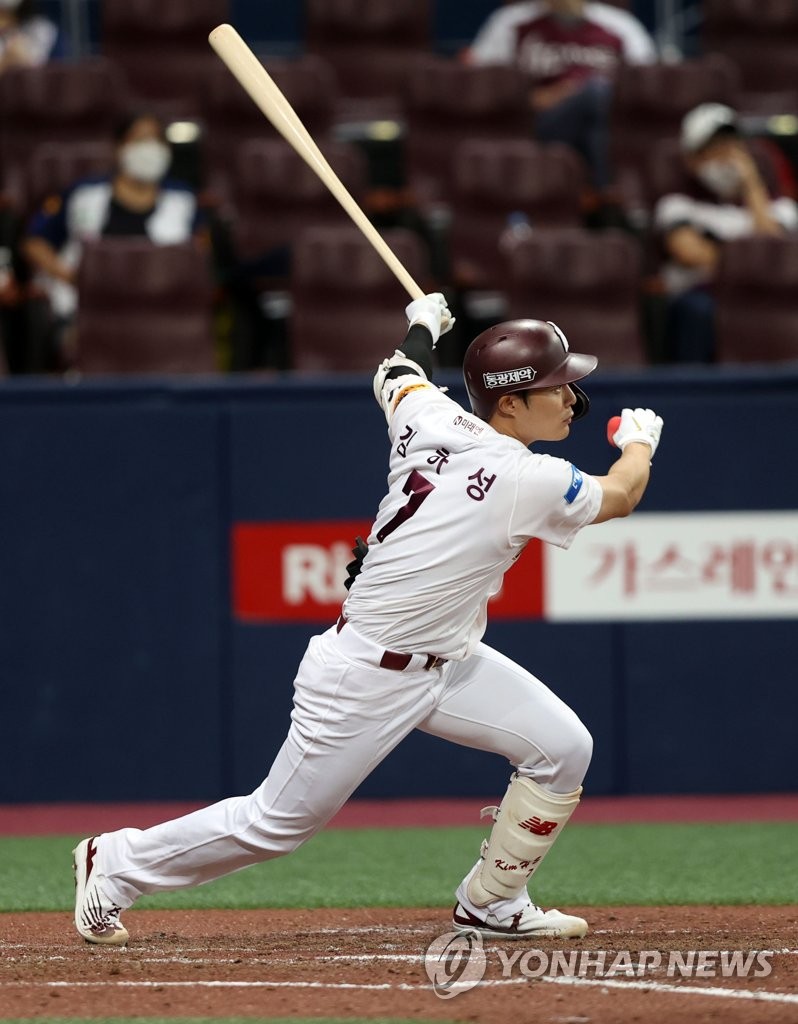 | ▲ In this file photo from Aug. 5, 2020, Kim Ha-seong of the Kiwoom Heroes hits a two-run single against the KT Wiz during the bottom of the fourth inning of a Korea Baseball Organization regular season game at Gocheok Sky Dome in Seoul. (Yonhap) |