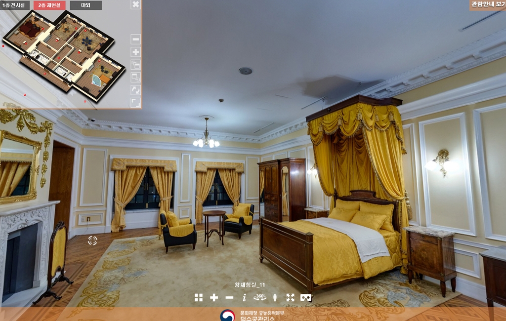 온라인 전시관은 석조전 내 황제와 황후의 서양식 생활공간을 관람할 수 있는 상설전시관, 지난달 폐막한 '대한제국 황제의 궁궐' 전시를 관람할 수 있는 특별전시관, 중화전·석어당·즉조당·준명당 등 덕수궁 내 전각의 내·외부를 살펴볼 수 있는 덕수궁 전각전시관으로 구성됐다.