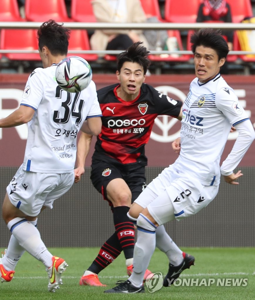 | ▲ In this file photo from Oct. 24, 2021, Lim Sang-hyub of Pohang Steelers (C) is guarded by Oh Jae-suk (L) and Kim Chang-soo of Incheon United during their clubs' K League 1 match at Pohang Steel Yard in Pohang, some 370 kilometers southeast of Seoul. (Yonhap) |