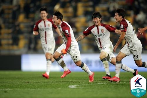 | ▲ Go Yohan of FC Seoul (L) celebrates his goal against Gwangju FC during the clubs' K League 1 match at Gwangju Football Stadium in Gwangju, some 330 kilometers south of Seoul, on Nov. 3, 2021, in this photo provided by the Korea Professional Football League. (PHOTO NOT FOR SALE) (Yonhap) |
