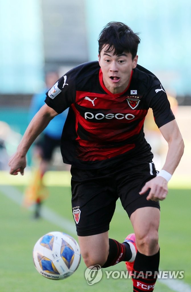 | ▲ Lim Sang-hyup of Pohang Steelers dribbles the ball against Nagoya Grampus during the clubs' quarterfinal match of the Asian Football Confederation Champions League at Jeonju World Cup Stadium in Jeonju, 240 kilometers south of Seoul, on Oct. 17, 2021. (Yonhap) |