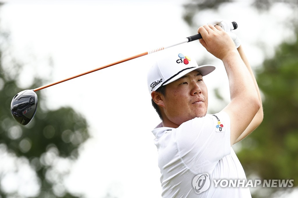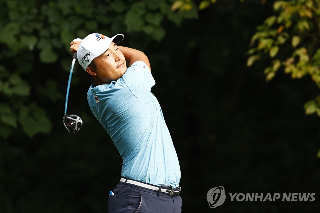 | ▲ In this Associated Press photo, Kim Si-woo of South Korea hits a tee shot at the ninth hole during the final round of the Wyndham Championship at Sedgefield Country Club in Greensboro, North Carolina, on Aug. 15, 2021. (Yonhap) |