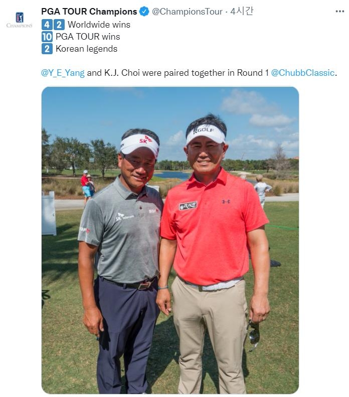 | ▲ 처브 클래식 1라운드 동반 라운드를 펼친 최경주와 양용은 [PGA 챔피언스투어 트위터 캡처. 재판매 및 DB 금지] |