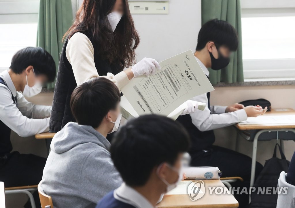| ▲ This photo taken on March 25, 2021, shows a teacher wearing a mask and gloves handing out examination papers to students at a high school in Suwon, just south of Seoul, amid the COVID-19 pandemic. (Yonhap) |