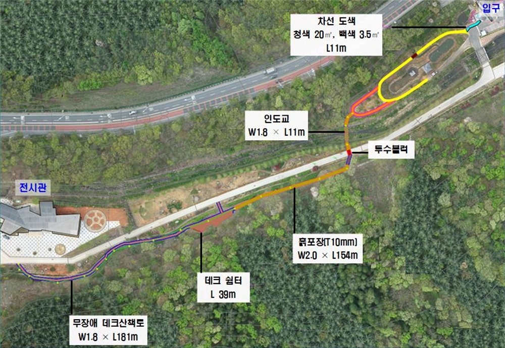 무궁화수목원 무장애 나눔길은 수목원 입구에서 전시관에 이르는 400m 구간에 조성된다.