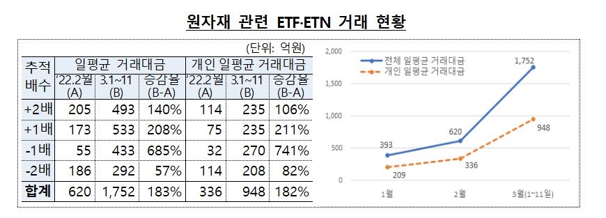 금감원에 따르면 이달(1∼11일) 중 원자재 관련 ETF와 ETN의 일평균 거래대금은 1천752억원으로, 지난달 일평균 거래대금(620억원) 대비 183% 급증했다.