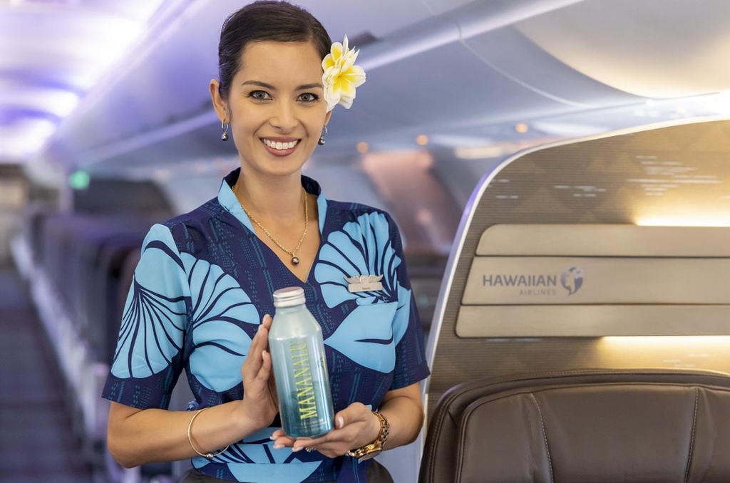 (서울=연합뉴스) 성연재 기자 = 하와이안항공이 지속 가능한 하와이 여행을 위한 노력의 하나로, 무한 재활용이 가능한 알루미늄 소재의 '마나날루 생수(Mananalu Water)'를 기내 서비스에 도입했다고 25일 밝혔다.