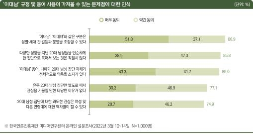 이대남 규정 및 용어 사용이 가져올 수 있는 문제점으로 든 7가지 예시문 중 '이대남, 이대녀와 같은 구분은 성별·세대 간 갈등과 분열을 조장할 수 있다'는 것에 전체 88.9%가 동의해 가장 높은 비율을 보였다.