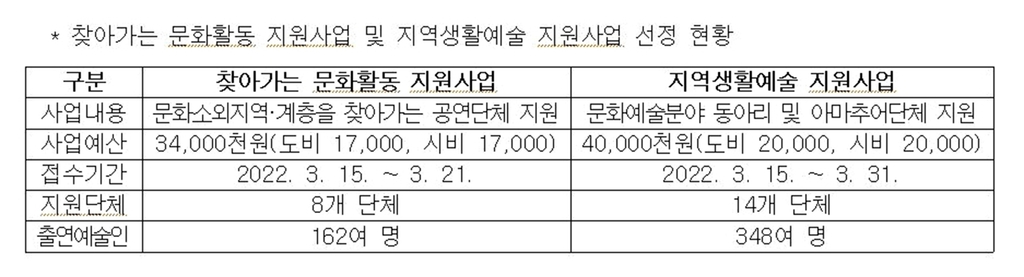 이런 지원사업을 통해 지역 문화예술인 500여 명이 오는 5월부터 전시, 공연 등 다양한 문화예술 활동을 펼친다.