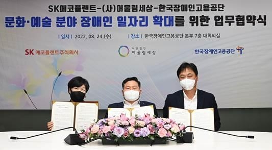| ▲ SK에코플랜트, 발달 장애 클래식 연주단 창단 (서울=연합뉴스) SK에코플랜트는 지난 24일 경기 성남시 한국장애인고용공단 본부에서 한국장애인고용공단과 대기업 1호 '문화·예술 분야 장애인 일자리 확대'에 관한 업무협약(MOU)을 체결한 뒤 발달 장애 클래식 연주단 창단식을 개최했다고 25일 밝혔다. 사진은 (오른쪽부터) 한영호 SK에코플랜트 HR담당임원, 조향현 한국장애인고용공단 이사장, 조명민 사단법인 어울림세상 대표가 협약식을 마치고 기념 촬영을 하는 모습. [SK에코플랜트 제공] |