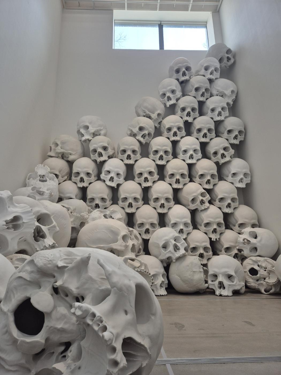 전시의 하이라이트는 '매스'(Mass)다. 2017년 호주 멜버른의 빅토리아 국립미술관 의뢰로 제작된 이 작품은 각각 무게 60kg, 높이 1.2m 크기인 두개골 형상 100개로 구성됐다. 제작될 때부터 공간 특성에 맞춰 다르게 전시되는 것을 전제로 만든 작품으로, 이번 전시에서는 넓지는 않지만 층고가 14m에 이르는 국립현대미술관 서울관 전시장의 특성에 맞춰 쌓여있던 두개골들이 무너져 내린 듯한 모습으로 설치됐다.