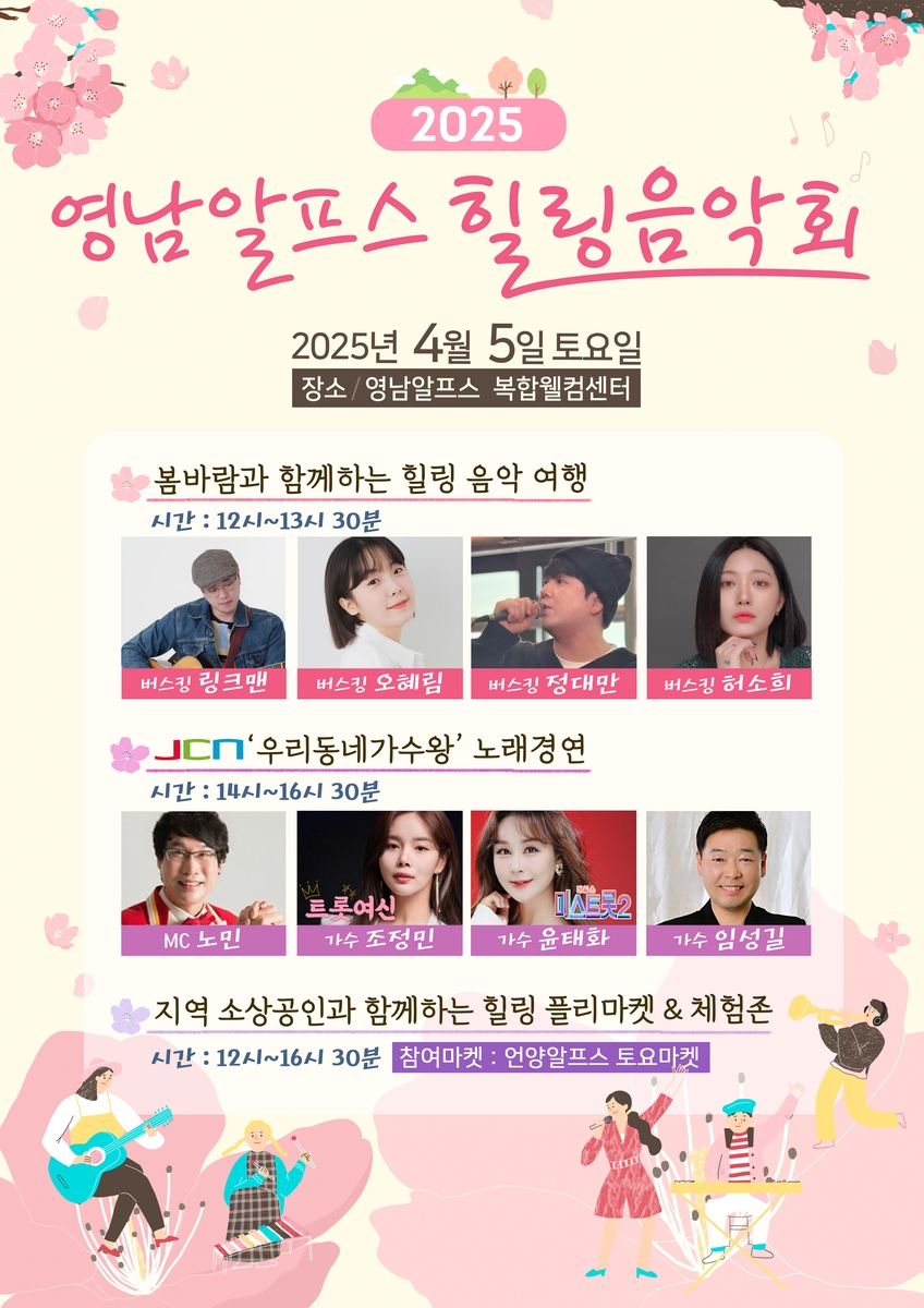 울주군 관계자는 "영남알프스 힐링음악회를 통해 봄바람이 함께하는 즐거운 음악이 군민과 관광객에게 힐링을 전하는 시간이 되길 바란다"고 밝혔다.