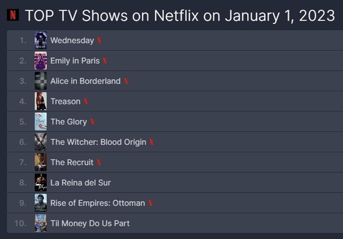 | ▲ This image captured from FlixPatrol's homepage shows its Top TV Shows on Netflix chart for Jan. 1, 2023. (PHOTO NOT FOR SALE) (Yonhap) |