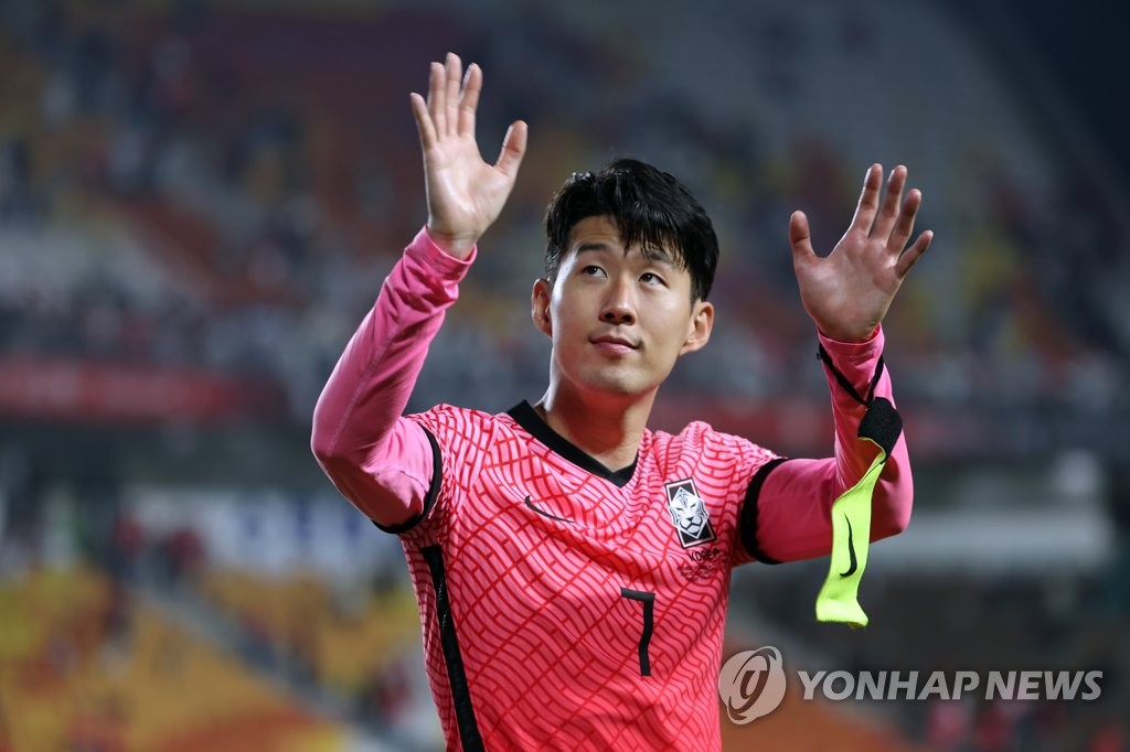 | ▲ Son Heung-min of South Korea salutes the crowd at Suwon World Cup Stadium in Suwon, 35 kilometers south of Seoul, after a 2-2 draw against Paraguay in the countries' friendly football match on June 10, 2022. (Yonhap) |