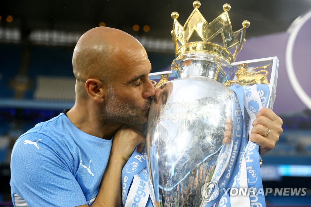 | ▲ 2년 연속 맨시티 우승시킨 과르디올라 감독 (맨체스터 로이터=연합뉴스) 페프 과르디올라 맨체스터 시티(맨시티) 감독(51·스페인)이 22일(현지시간) 영국 맨체스터 에티하드 스타디움에서 열린 잉글랜드 프리미어리그(EPL) 38라운드 경기가 끝난 뒤 우승 트로피에 입을 맞추고 있다. 과르디올라 감독이 부임한 2017년 이후 맨시티는 4차례 정상에 올랐다. 2022.5.23 alo95@yna.co.kr |
