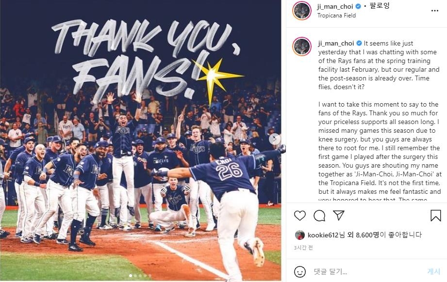 최지만은 14일(한국시간) 자신의 소셜네트워크서비스(SNS)에 한글과 영어로 팬들을 향해 감사 인사를 했다.