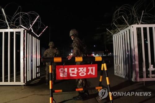 | ▲ Soldiers close the front gate of an Army boot camp in the northern county of Yeoncheon on Nov. 25, 2020, after dozens of newly enlisted soldiers tested positive for the new coronavirus. (Yonhap) |