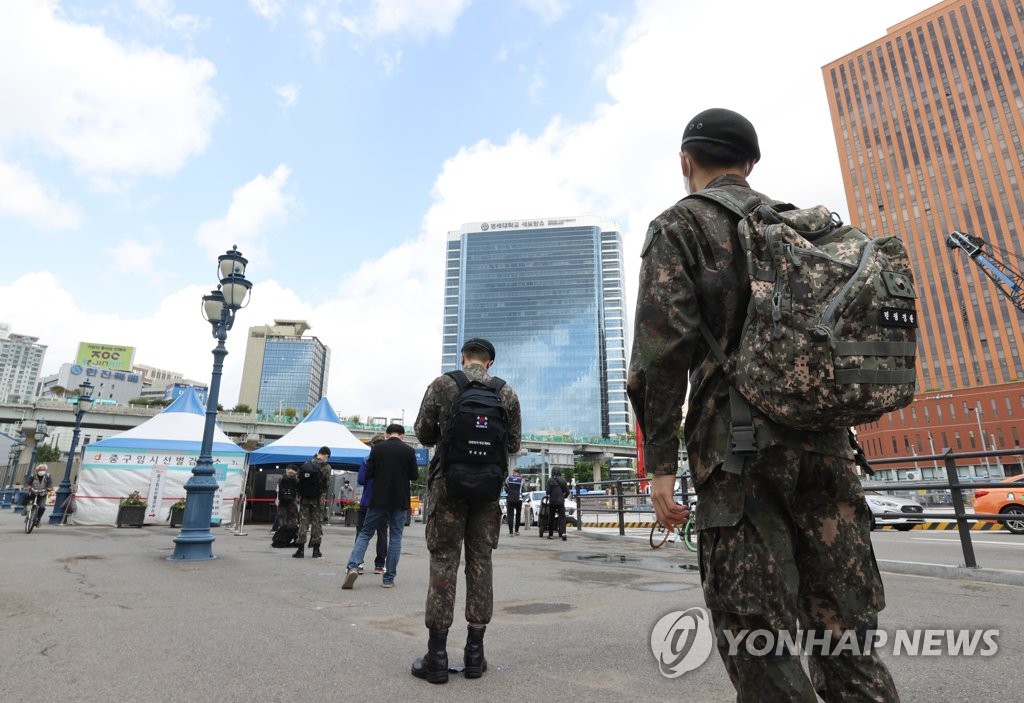 | ▲ In this file photo taken on May 25, 2021, soldiers wait in line to receive COVID-19 tests in central Seoul. (Yonhap) |