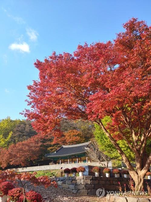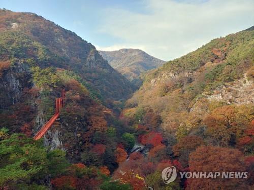 (순창=연합뉴스) 2일 전북 순창군 강천산에 단풍이 곱게 물들기 시작해 탐방객들의 눈길을 붙잡고 있다.