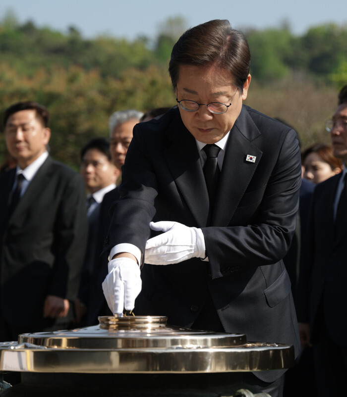 Lee Jae-myung, former leader of the liberal Democratic Party, burns incense to pay tribute to South Korean patriotic martyrs and war dead at the National Cemetery in Seoul on April 28, 2025, one day after he was picked as its candidate in the June 3 presidential election. (Pool photo) (Yonhap)
