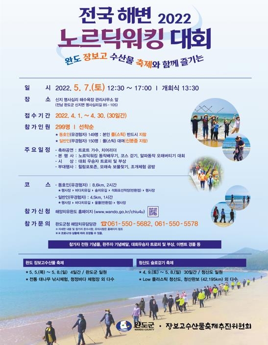 (완도=연합뉴스) 조근영 기자 = '해양치유 1번지' 전남 완도군이 전국 최초로 오는 5월 7일 전국 최초로 해변 노르딕워킹 대회를 개최한다.