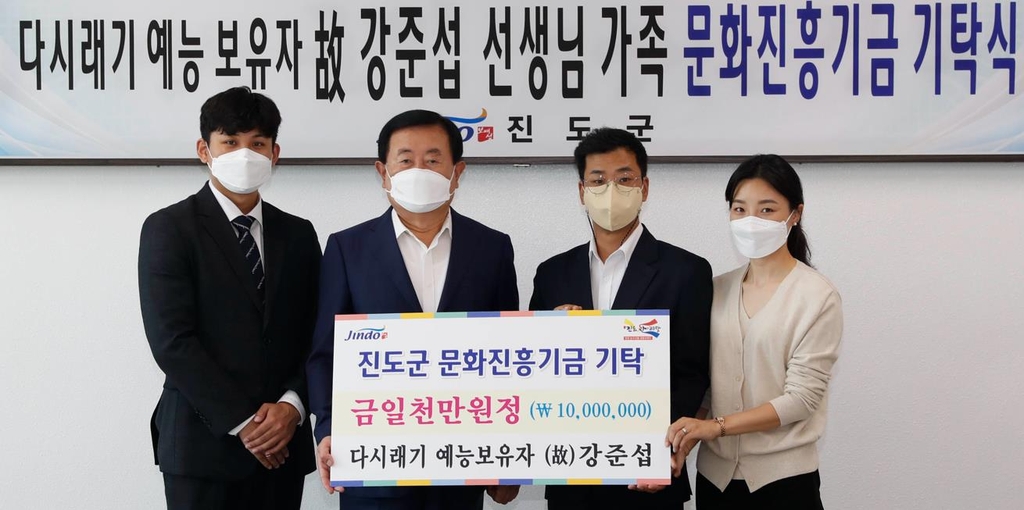 (진도=연합뉴스) 조근영 기자 = 지난달 24일 세상을 떠난 진도 다시래기 예능보유자 강준섭 씨 유족이 진도군에 문화진흥기금 1천만원을 기탁했다.