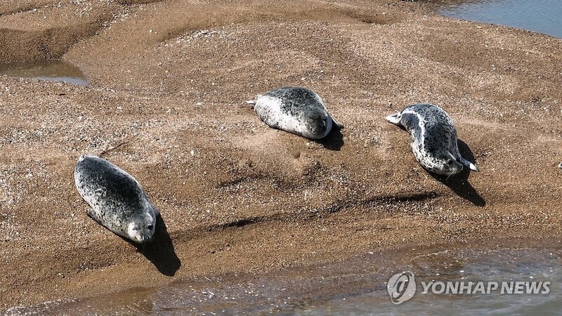 | ▲ 점박이물범은 가로림만에서 휴식 중 (서산=연합뉴스) 충남 서산 가로림만에서 멸종위기 해양보호생물이자 천연기념물인 점박이물범들이 카메라에 잡혔다. 뭍에서 눈으로 점박이물범을 관찰할 수 있는 곳은 국내에서 가로림만이 유일하다. 사진은 지난달 23일 서산시 대산읍 오지리 앞 넓은 모래톱에서 쉬고 있는 점박이물범들. 2024.6.4 [서산시 제공. 재판매 및 DB 금지] cobra@yna.co.kr |