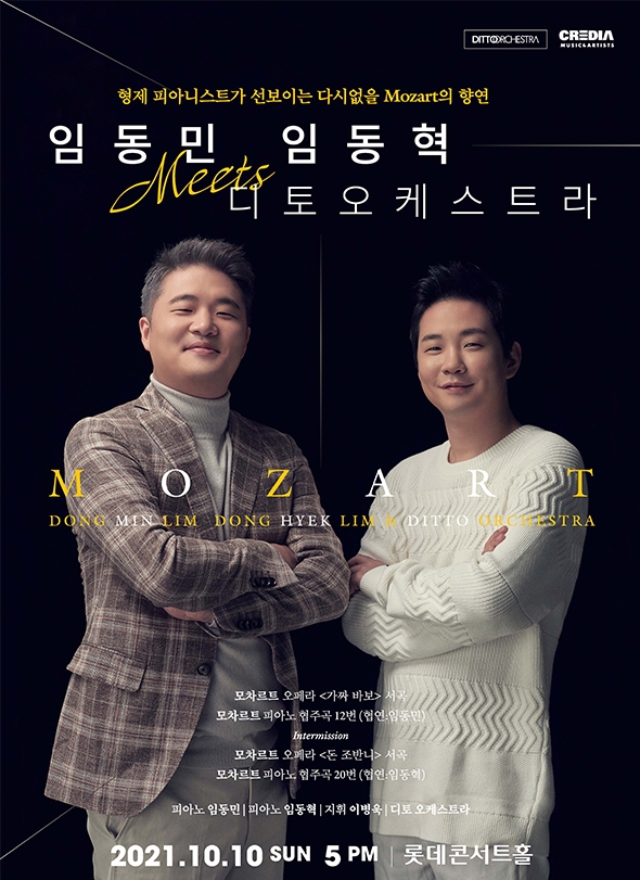 1부에서 임동민이 모차르트 '피아노 협주곡 12번'을, 2부에서 임동혁이 모차르트 '피아노 협주곡 20번'을 이병욱이 이끄는 디토 오케스트라와 협연한다. 디토 오케스트라는 모차르트 오페라 '가짜 바보' 및 '돈 조반니' 서곡도 선보인다.