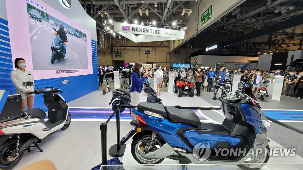 ▲ 부산국제모터쇼 전기 이륜차 공개 (부산=연합뉴스) 조정호 기자 = 14일 부산 해운대구 벡스코에서 열린 부산국제모터쇼 프레스데이 행사에서 국내 이륜차 전문 브랜드인 디엔에이모터스가 전기 이륜차(프로젝트명 ED-1)를 최초로 공개하고 있다. 2022.7.14 ccho@yna.co.kr